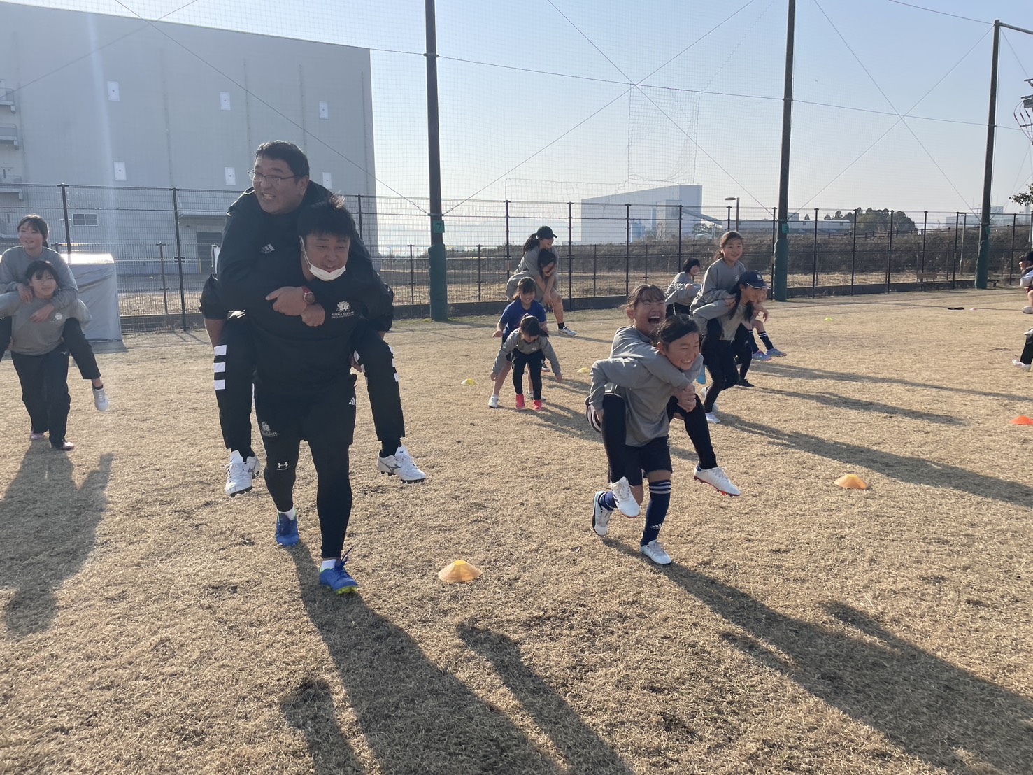 と通常の試合、最後に全体でリレーを行いました。コーチも選手と一緒に